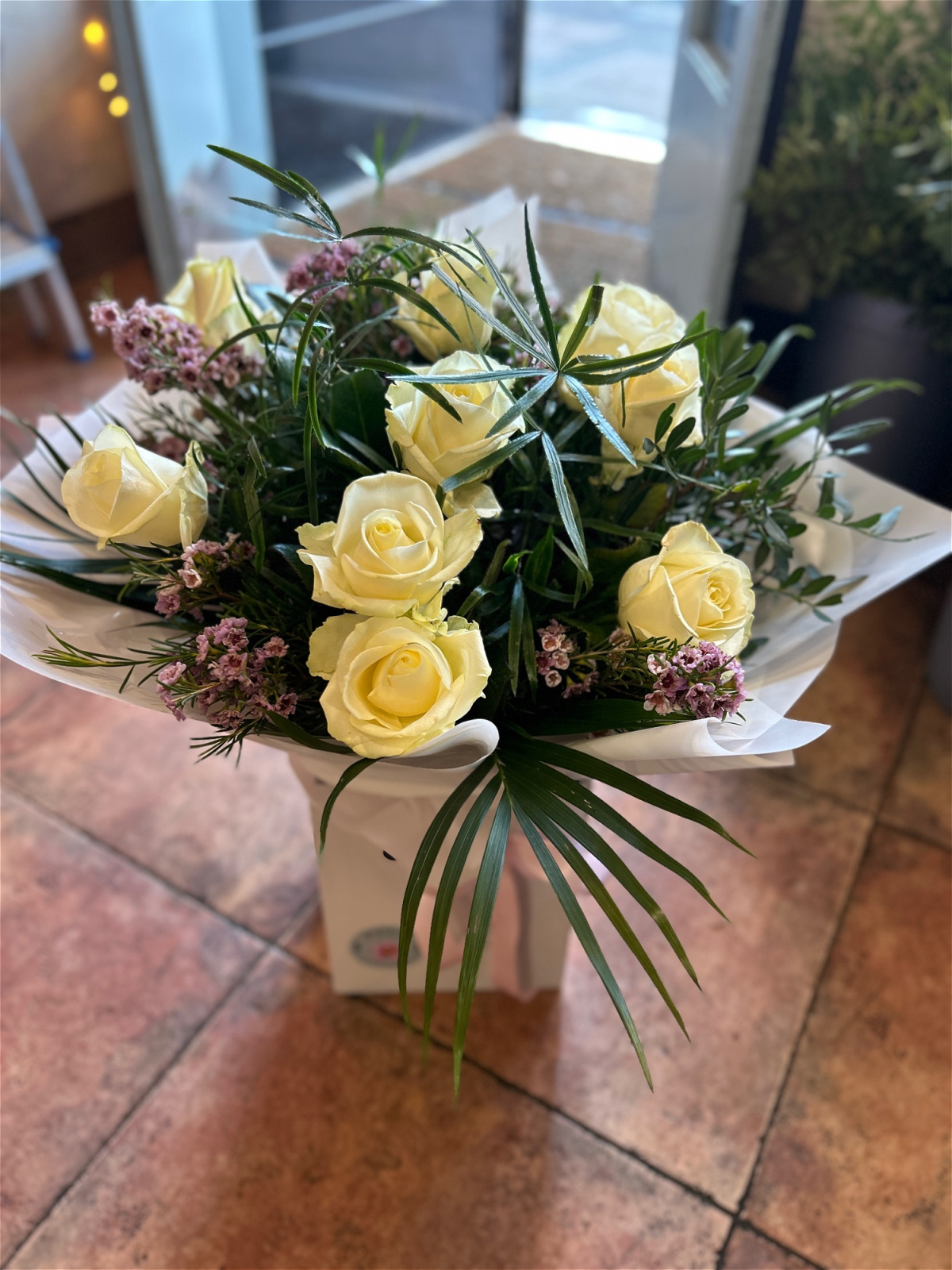 Our florist has designed this gorgeous arrangement of 12 large white roses with eucalyptus and wax flower.
