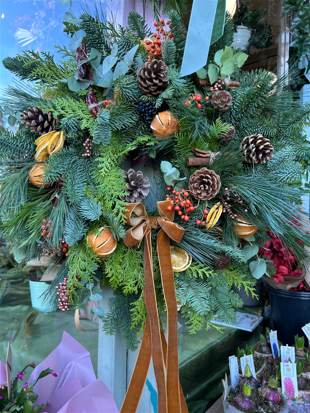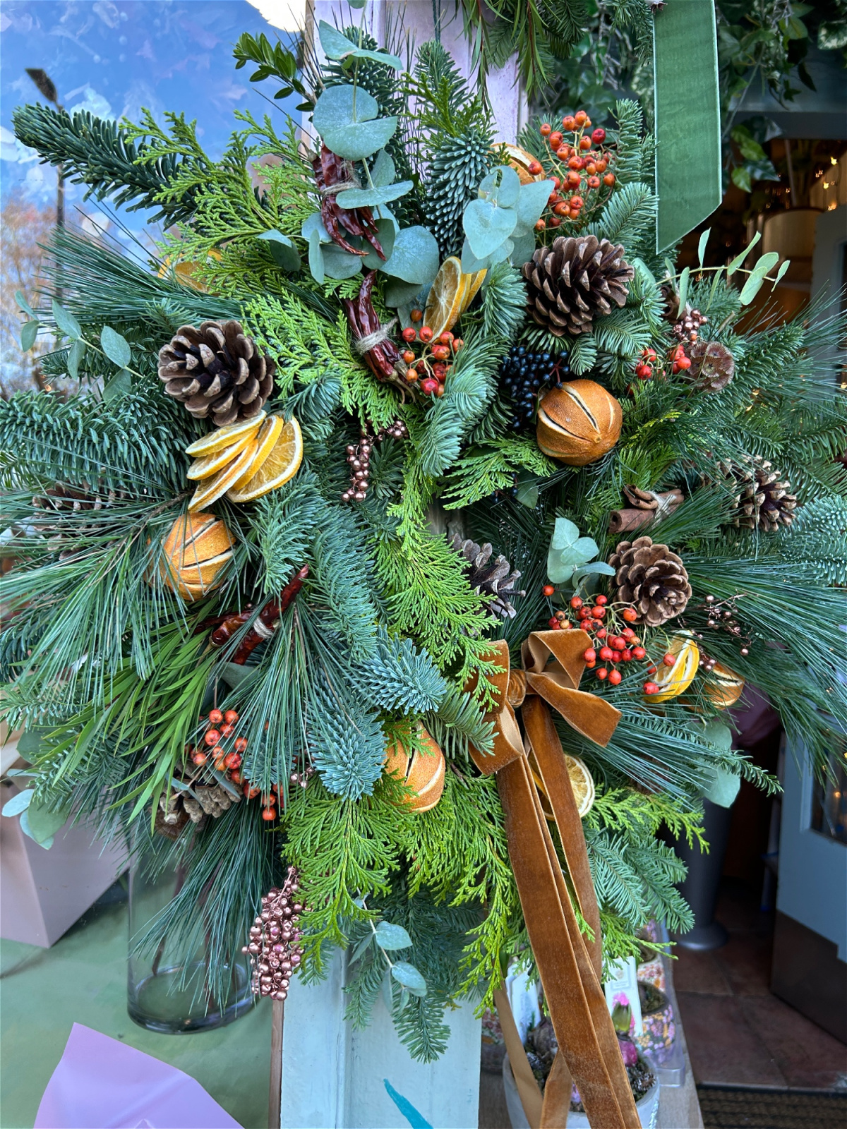 It’s that time again, time to hang your Christmas wreath!! our florist has designed a lovely natural wreath that includes fresh berries, acorns , dried chillies orange slices along with full oranges and eucalyptus and Scabiosa.