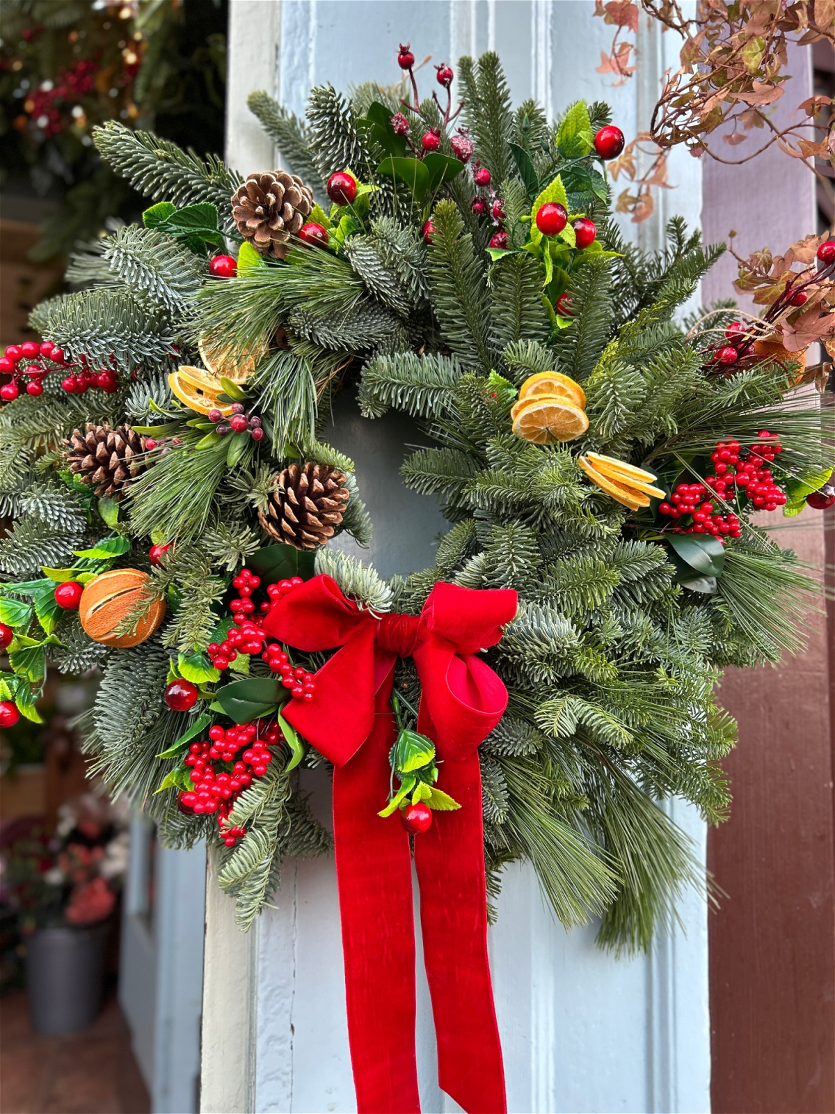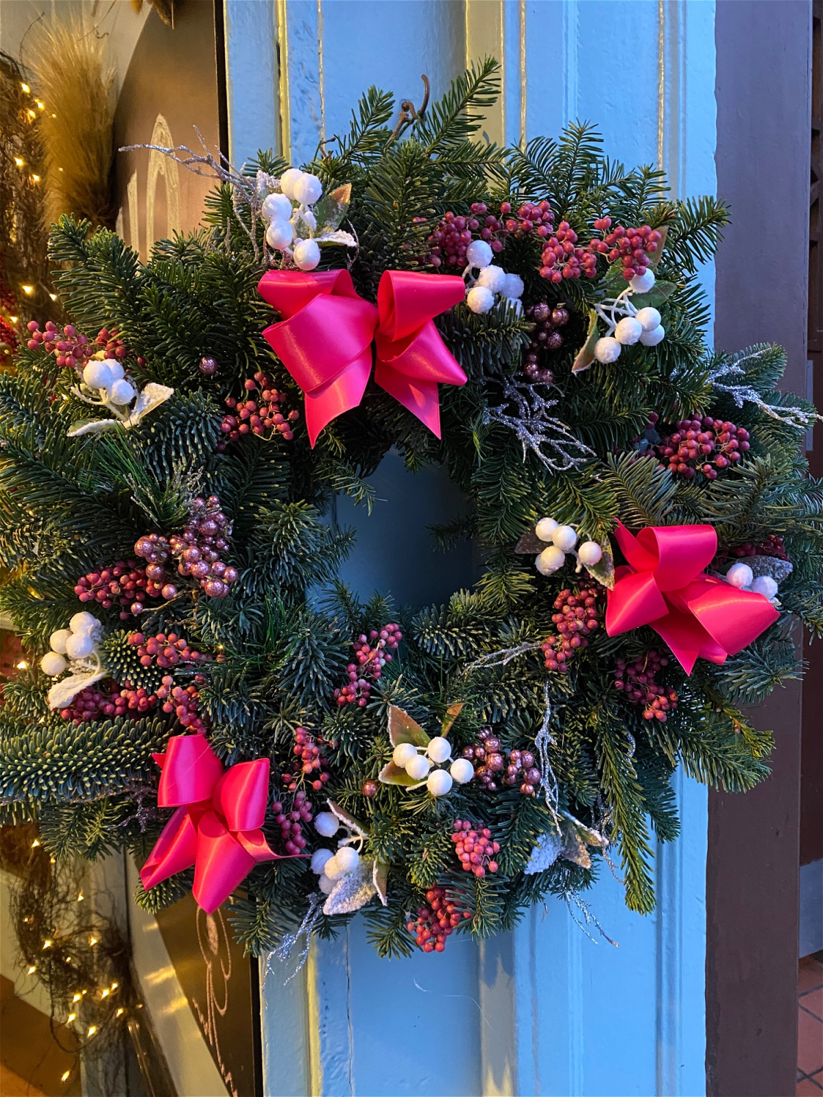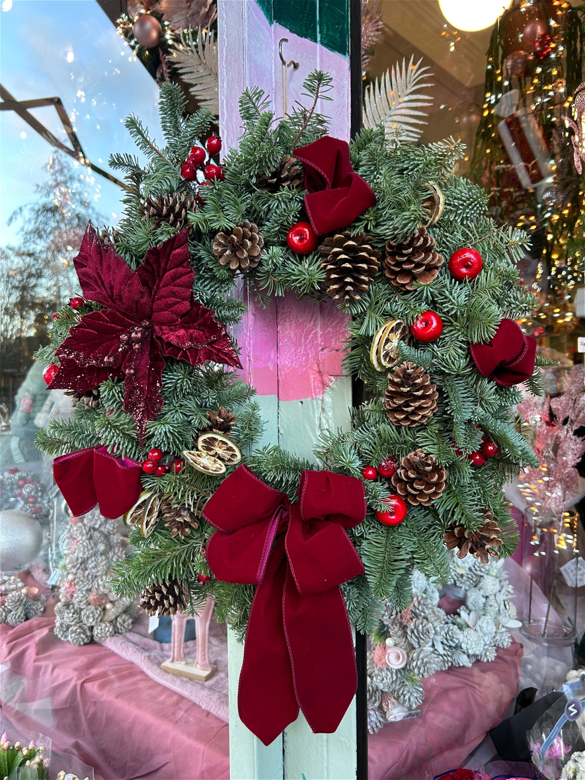 We use fresh foliages, pine, berries and dried fruit and acorns among other festive materials. Leaving you with a statement piece on your front door.