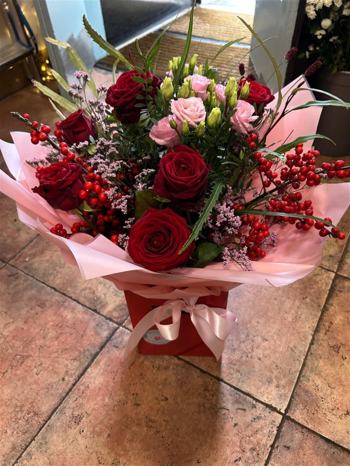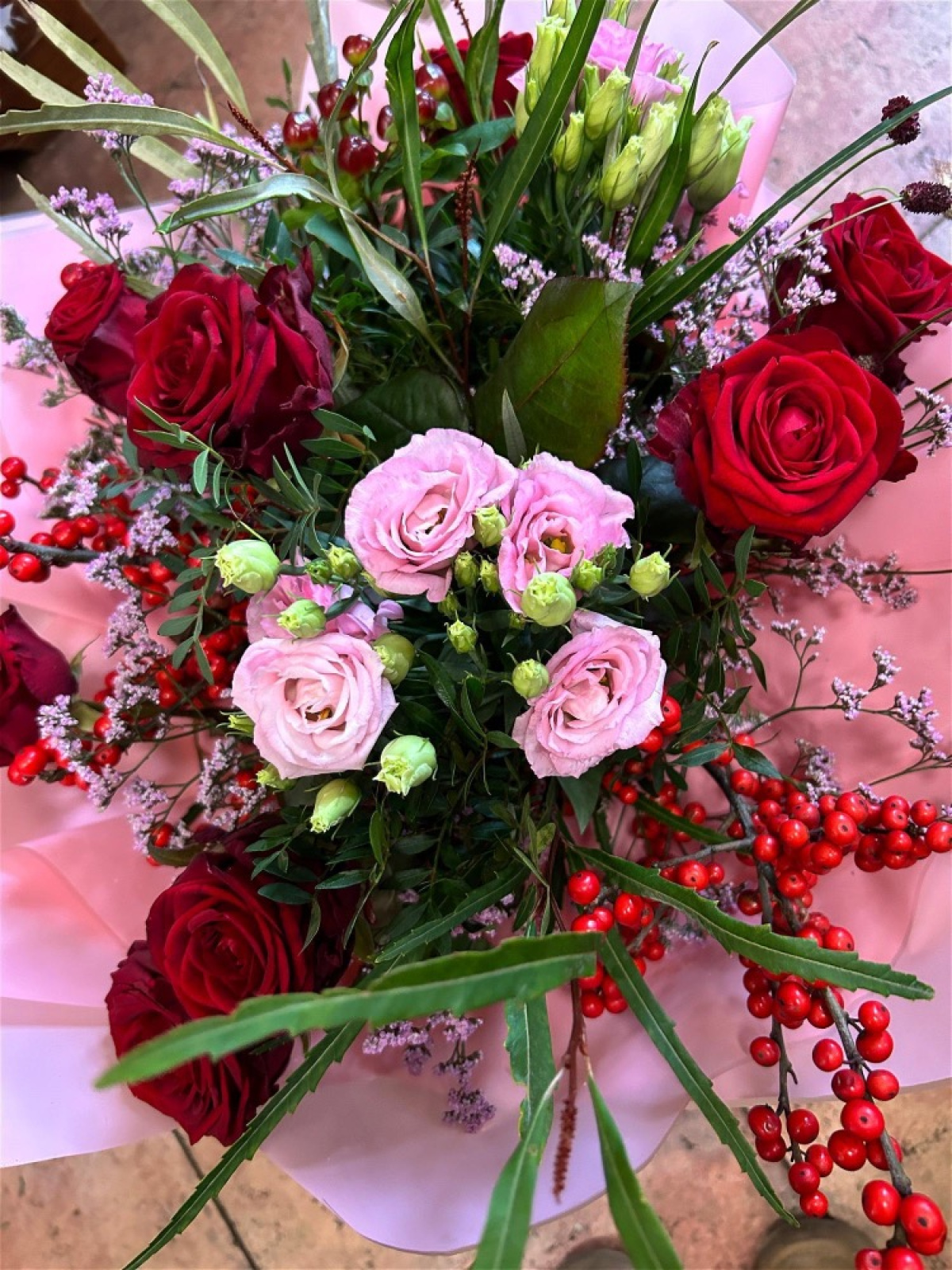 A lovely selection of red roses, red ilex berries, hypericum berries, pink Lisianthus, complement with pink limonium and deep green foliage.