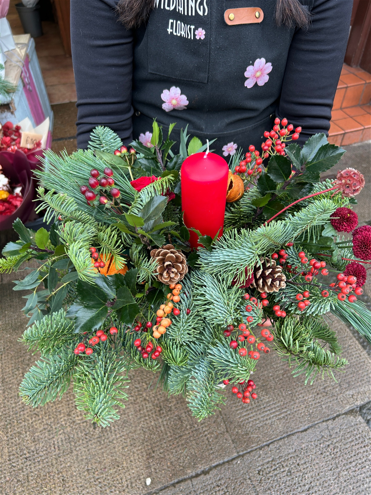 With dried oranges acorns and including a red pillar candle.