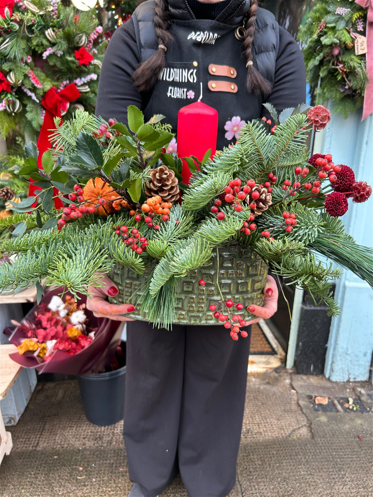 A perfect gift to send to your family or friends, so don’t miss on this arrangement! it’s full of Christmas foliage, holly stems, red roses and berries, and more.