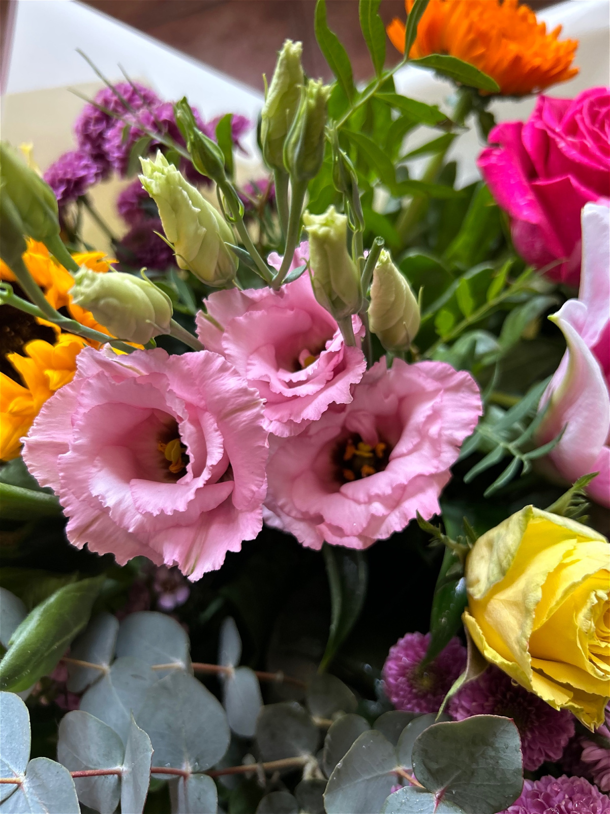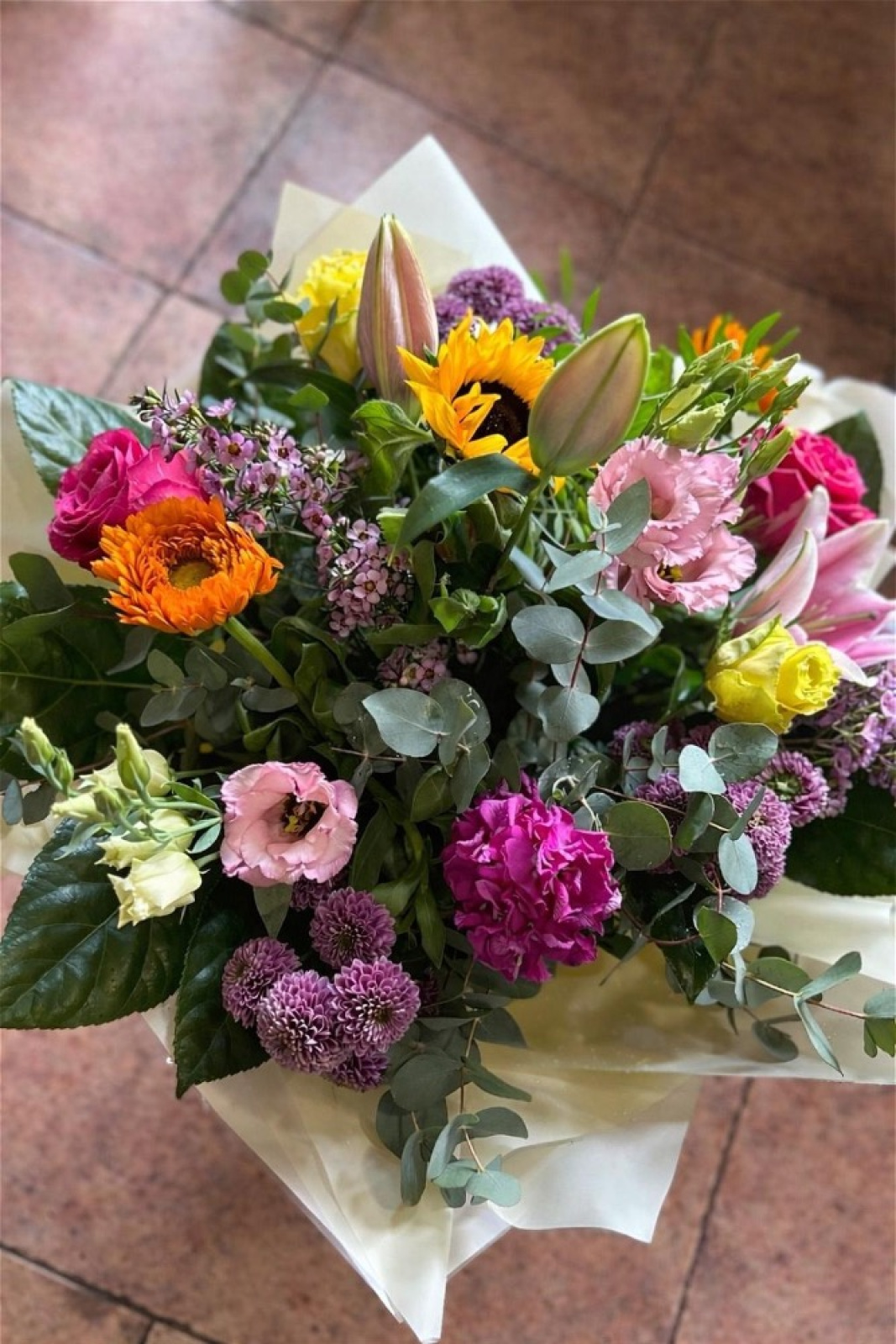 A beautifully handcrafted hand-tie bursting with colour and texture. This arrangement features vibrant sunflowers, soft pink lisianthus, rich cerise carnations, yellow roses, orange gerberas, and delicate seasonal blooms, all nestled among lush eucalyptus foliage. Wrapped in soft coloured wrap. This bouquet has a fresh natural feel with a joyful mix of bold and pastel tones. Perfect for celebrating special moments, brightening someone’s day, or making a thoughtful statement gift.