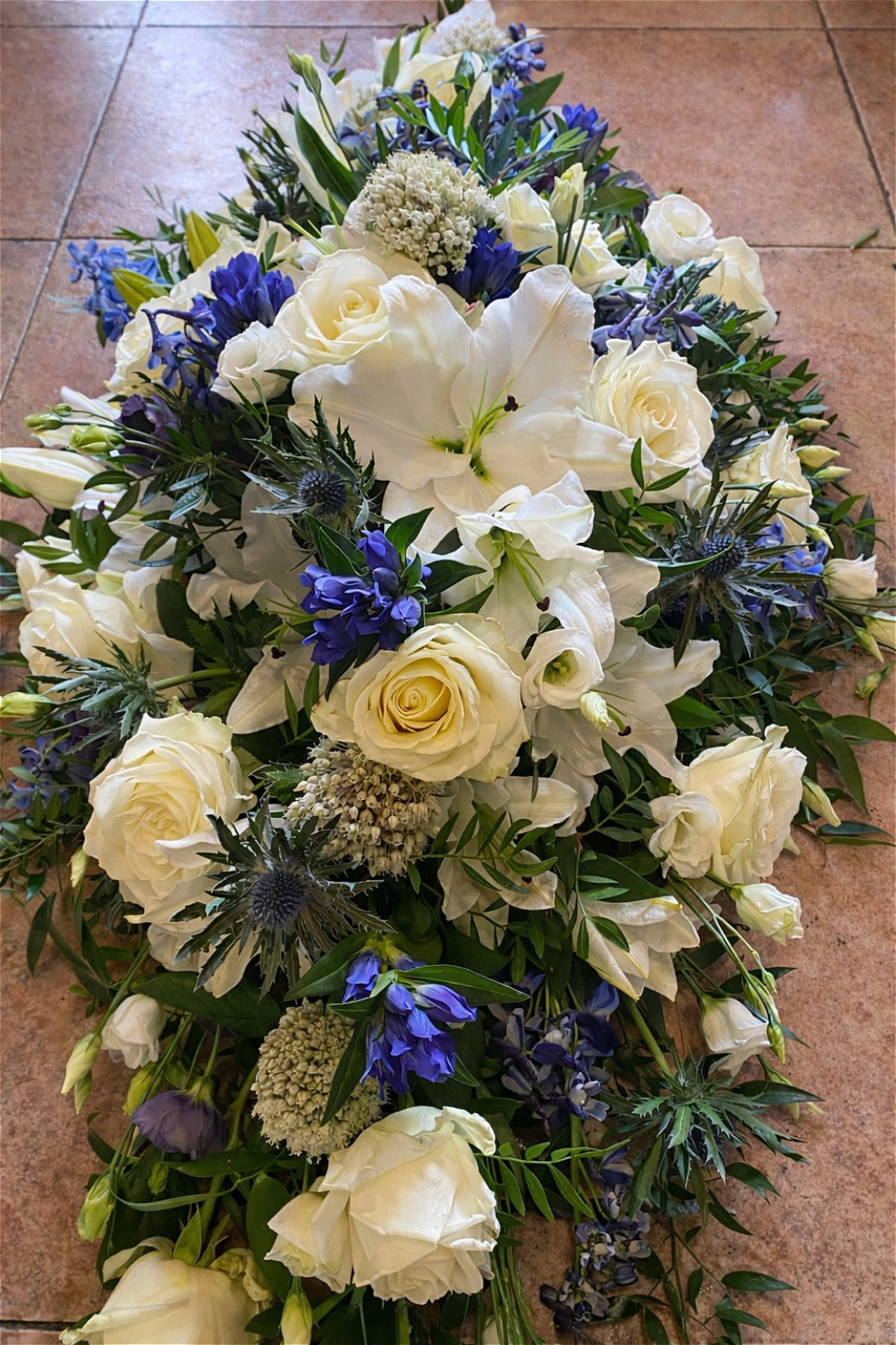 This seasonal sympathy tribute with deep blue tones, thistles touch of purple with open white lilies.