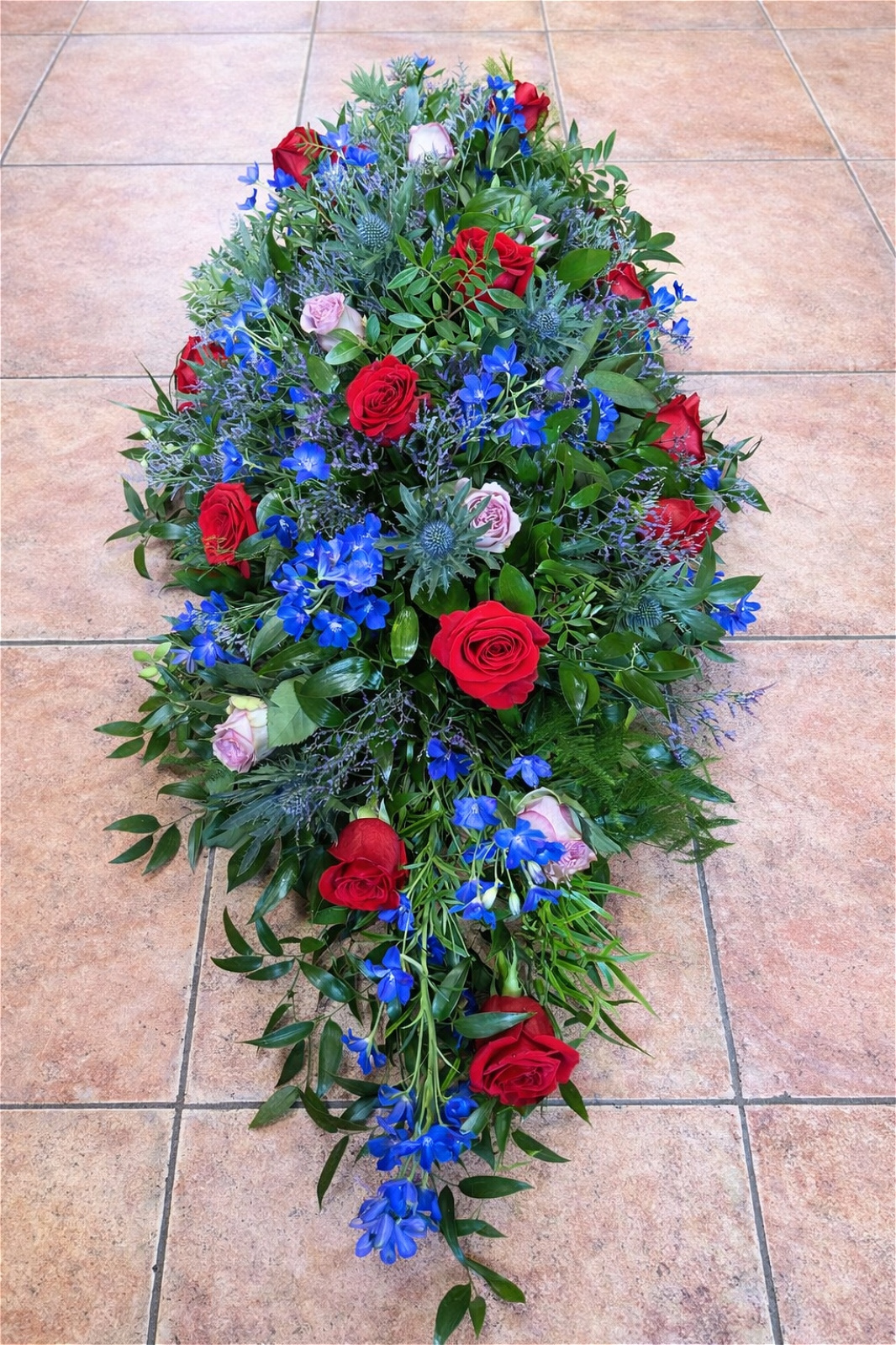 This large casket spray with deep red roses, deep blue delphiniums a touch of deep lilac roses and finished with Thistles and rich green foliage. Keeping this style a cross between modern and traditional and our florist has filled this design full of beautiful blooms.