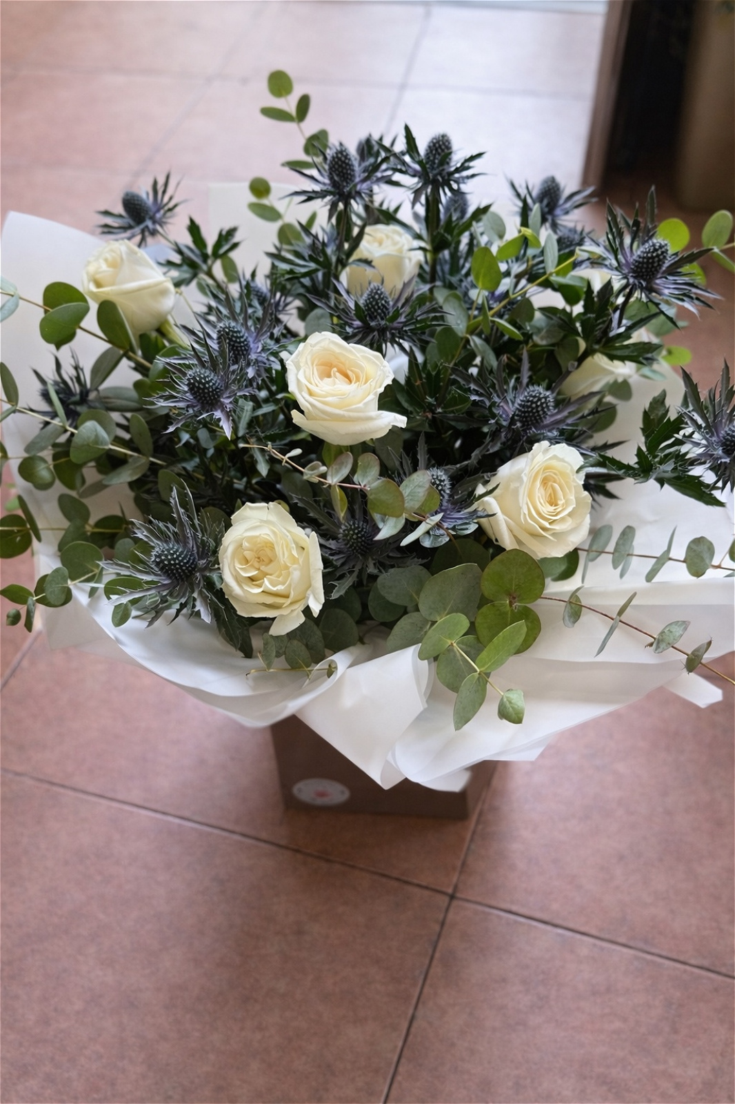 This striking arrangement brings together the soft elegance of white roses with the unique texture of silver-blue thistles. The classic beauty of the roses is beautifully balanced by the bold, architectural shape of the thistles, creating a modern yet timeless display.