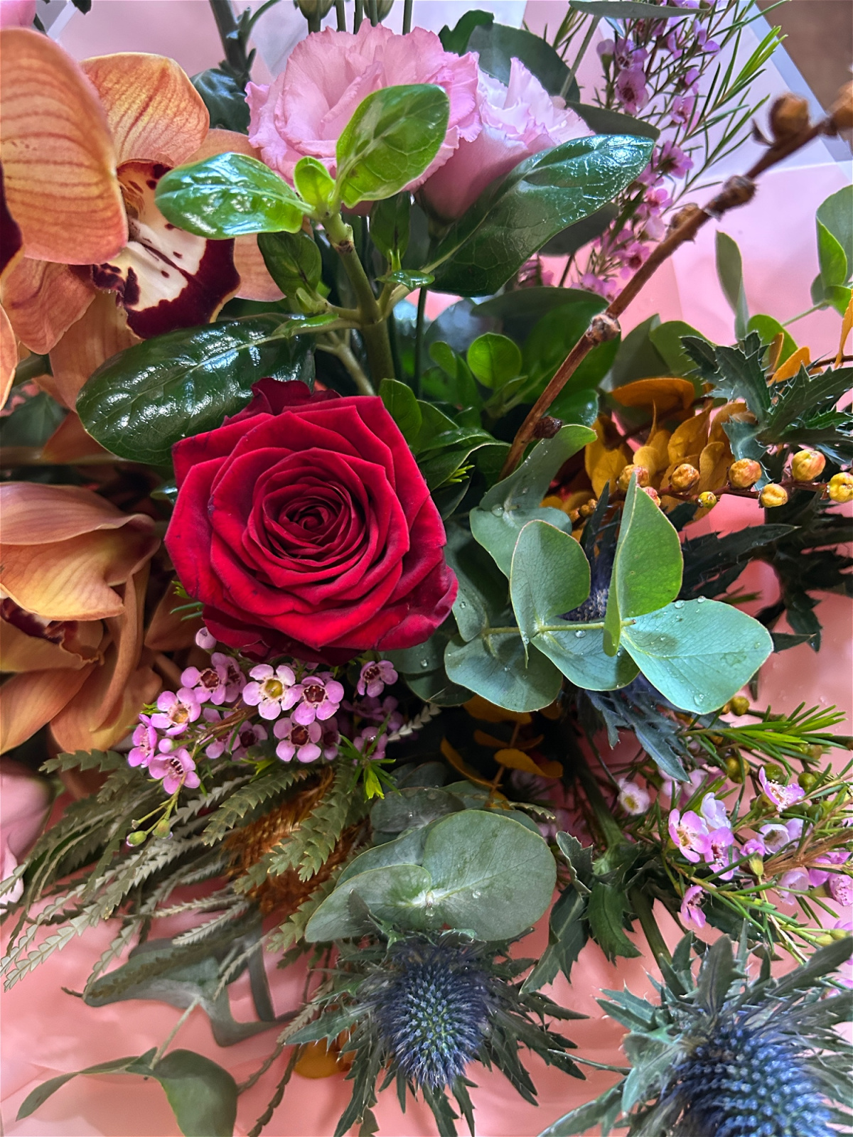 Your floral arrangement will be in a water and placed in our flower box with our signature satin ribbon of your choice.