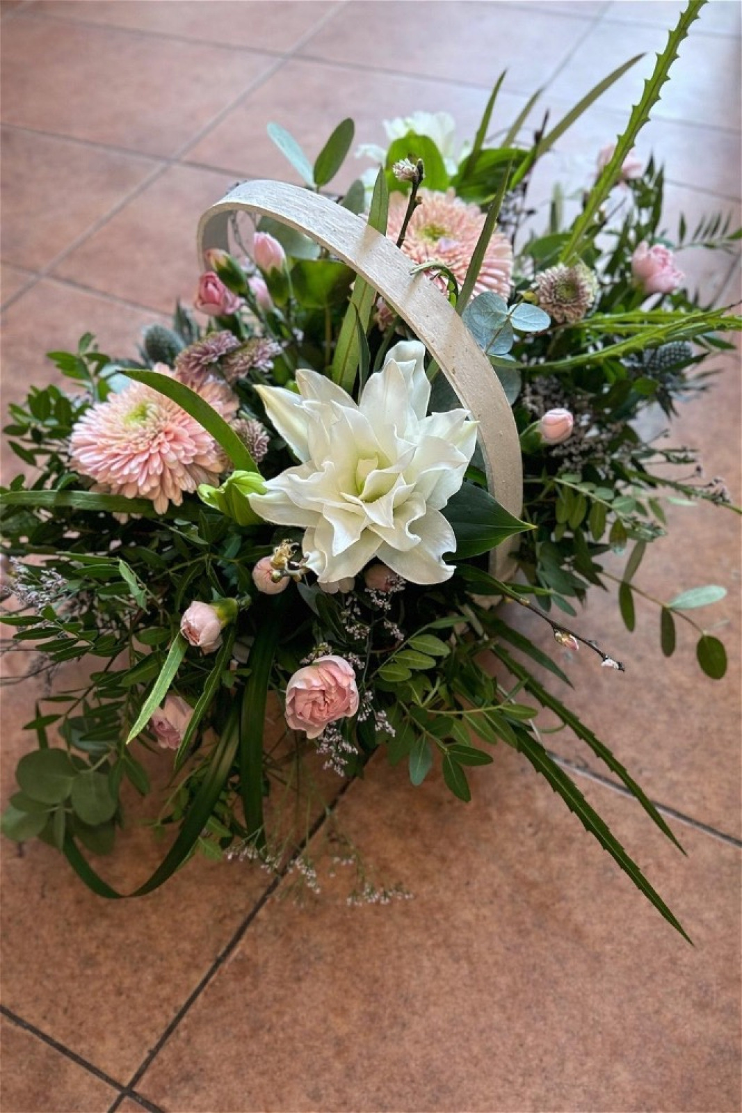A beautifully arranged flower basket featuring soft, elegant lilies paired with cheerful gerbera blooms. The lilies bring a sense of calm sophistication, while the gerberas add a fresh pop of colour and warmth. Carefully complemented with seasonal foliage and delicate accents, this basket has a natural, garden-style feel.